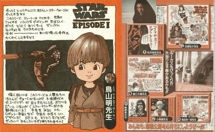 El dibujó se publicó en la edición #25 de 1999 de la revista Weekly Shonen Jump, justamente para el estreno de la película. Decimos que ahora fue un buen momento para que el dibujo volviera a surgir pues hace unos días (4 de Mayo) fue el día de Star Wars, además de eso “La amenaza fantasma” está cumpliendo 25 años y volvió a cines y por último es un gran homenaje pues hace unos meses falleció Toriyama.