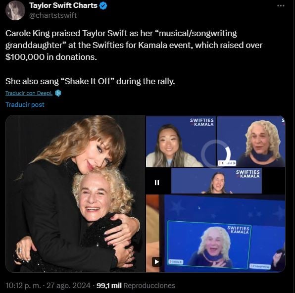 Lo que hace creer que esta vez sí dio su permiso fue está involucrada Carole King, quien es muy cercana a Swift. Ella organizó un evento virtual llamado “Swifties for Kamala” donde varias estrellas se reunieron a hacer algunas presentaciones y hablar de la campaña política. Aquí las fans de Taylor podían hacer donaciones voluntarias o comprar mercancía espacial. Todas las ganancias se destinaron para apoyar la campaña política de la candidata y también apoyar a casusas benéficas. Sorprendentemente las Swifties recaudaron más de $100,000 dólares.