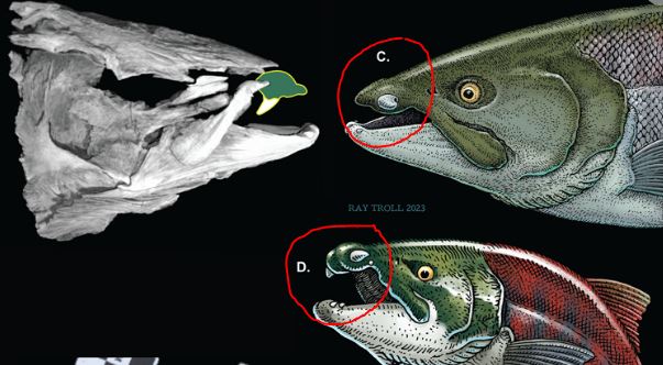 Como podemos ver en la imagen anterior, los salmones actuales por sí solos son bastante monstruosos, pero este ancestro va mucho más allá. El nombre oficial del nuevo pez esOncorhynchus rastrosus” y se cree que vivió hace 5 millones de años. Como mencionamos antes una de las cosas que más llamó la atención es el tamaño pues se cree que esté animal podía medir hasta 2.7 metros de largo. EL otro punto de interés es que tenía dos grandes colmillos al final de su boca, es por eso que le apodo “Salmón dientes de sable”, pero a diferencia del tigre con el mismo nombre, esté pez tenía los colmillos en horizontal.