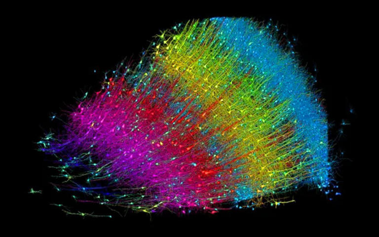 La imagen anterior es el mapa en cuestión y aunque a simple vista no tiene sentido es algo increíble. En este mapa se presentan más de 57,000 neuronas (cada puntito es una), 230 milímetros de vasos sanguíneos y 150 millones de sinapsis (Unión entre neuronas). De igual forma se ve que el mapa se divide en varios colores y esto se debe a que cada color simboliza una función específica del cerebro.