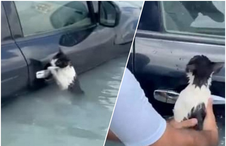 Rescatan un gatito en las fuertes lluvias que inundan Dubai