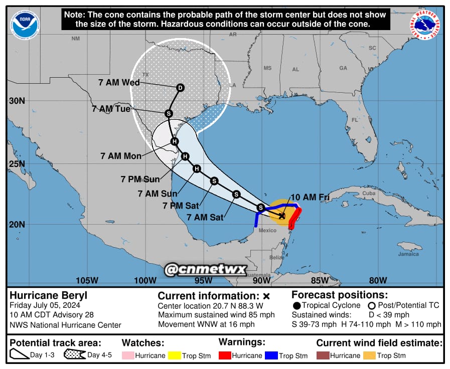 Los vientos máximos sostenidos de Beryl han disminuido a aproximadamente 85 mph (140 km/h) con ráfagas más fuertes. Se anticipa un debilitamiento rápido y continuo mientras el huracán cruza la Península de Yucatán, aunque podría experimentar una lenta reintensificación al regresar sobre las aguas cálidas del Golfo de México.