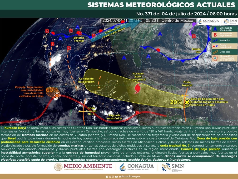 De mantener su trayectoria y velocidad de desplazamiento, se pronostica que Beryl podría tocar tierra durante la noche de hoy jueves o la madrugada del viernes sobre la costa central de Quintana Roo. Por otro parte, la zona de baja presión con probabilidad para desarrollo ciclónico en el Océano Pacífico se desplazará frente a las costas de Colima y Jalisco, propiciando lluvias fuertes en Michoacán, Colima y Jalisco, además de rachas fuertes de viento, oleaje elevado y posible formación de trombas marinas en zonas costeras de dichas entidades.