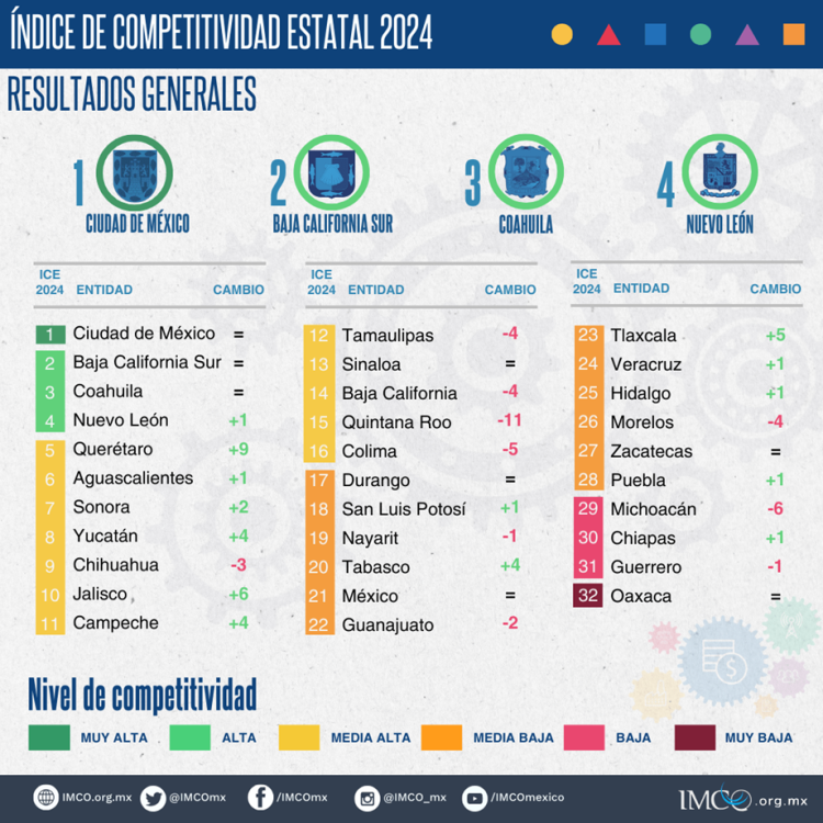 Esta edición del ICE está compuesta por 50 indicadores agrupados en seis subíndices, con los que se clasifican los estados por nivel de competitividad. La Ciudad de México se ubica en primer lugar, mientras que Oaxaca la última posición, con competitividad muy baja. En el ICE 2024 mejoran 14 entidades, diez retroceden y ocho se mantienen igual. Los datos reflejan que el efecto de la pandemia se ha disipado y evidencian retos para el diseño de políticas públicas.