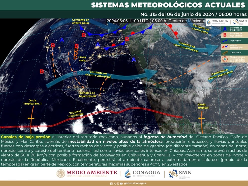 El Servicio Meteorológico Nacional (SMN) prevé que para este día, canales de baja presión al interior del territorio mexicano, aunados al ingreso de humedad del Océano Pacífico, Golfo de México y Mar Caribe, además de inestabilidad en niveles altos de la atmósfera, producirán chubascos y lluvias puntuales fuertes con descargas eléctricas, fuertes rachas de viento y posible caída de granizo (de diferente tamaño) en zonas del norte, noreste, centro y sureste del territorio nacional, así como lluvias puntuales intensas en Chiapas.