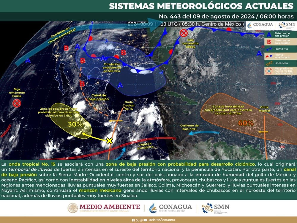 El Servicio Meteorológico Nacional |SMN) prevé para este día, la onda tropical No. 15 se extenderá sobre la península de Yucatán y el sureste del país y se asociará con una zona de baja presión con probabilidad para desarrollo ciclónico en el golfo de Tehuantepec, lo cual originará un temporal de lluvias de fuertes a intensas en las regiones mencionadas.