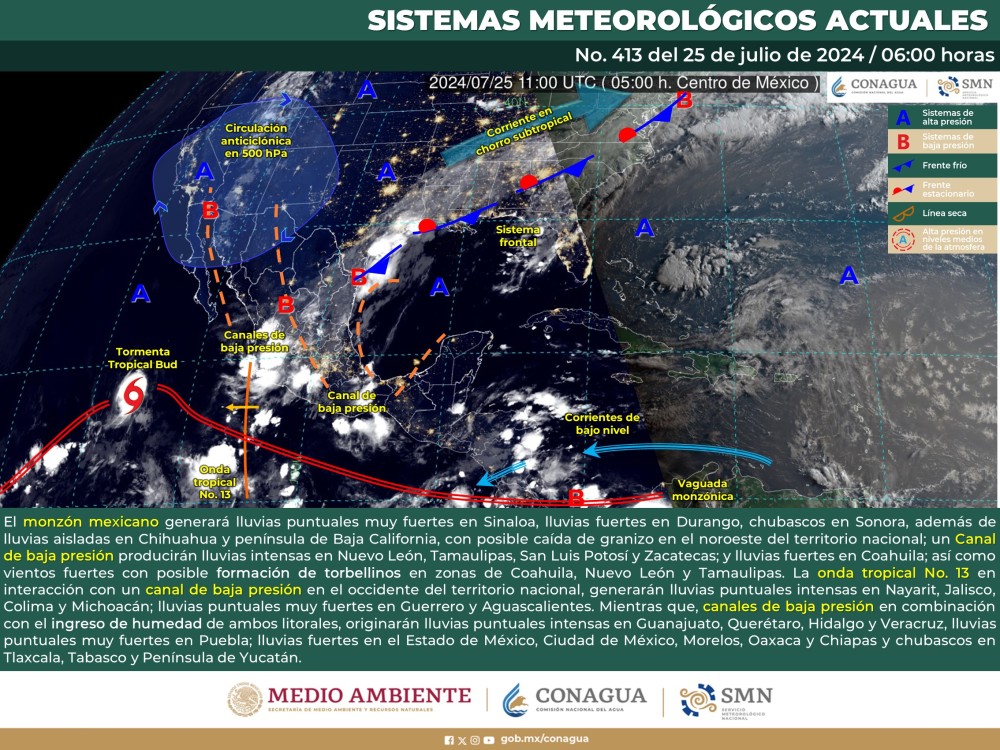 El Servicio Meteorológico Nacional (SMN),  prevé que para hoy, el monzón mexicano generará lluvias puntuales muy fuertes en Sinaloa, lluvias fuertes en Durango, chubascos en Sonora, rachas de viento fuertes y posible caída de granizo en el noroeste del territorio nacional; además de lluvias aisladas en Chihuahua y península de Baja California. Canal de baja presión sobre el noreste de la República mexicana aunado a inestabilidad en niveles altos de la atmósfera, producirán lluvias intensas en Nuevo León, Tamaulipas, San Luis Potosí y Zacatecas; y lluvias fuertes en Coahuila; así como vientos fuertes con posible formación de torbellinos en zonas de Coahuila, Nuevo León y Tamaulipas.