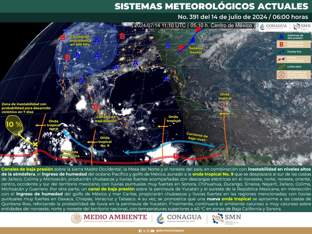 El Servicio Meteorológico Nacional (SMN) prevé que hoy canales de baja presión sobre la sierra Madre Occidental, la Mesa del Norte y el noreste del país, en combinación con inestabilidad en niveles altos de la atmósfera, el ingreso de humedad del océano Pacífico y golfo de México, aunado a la onda tropical No. 9 que se desplazará al sur de las costas de Jalisco, Colima y Michoacán, producirán chubascos y lluvias fuertes acompañadas con descargas eléctricas en el noroeste, norte, noreste, oriente, centro, occidente y sur del territorio mexicano, con lluvias puntuales muy fuertes en Sonora, Chihuahua, Durango, Sinaloa, Nayarit, Jalisco, Colima, Michoacán y Guerrero.