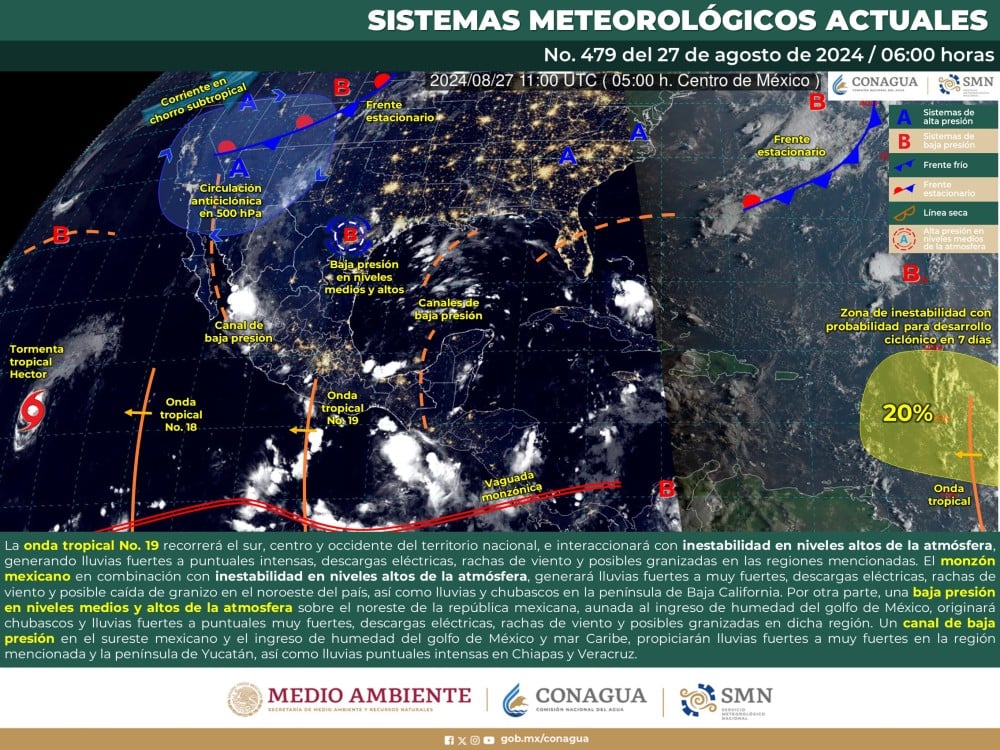 El Servicio Meteorológico Nacional (SMN), prevé que para este día, la onda tropical No. 19 recorrerá el sur, centro y occidente del territorio nacional, e interaccionará con inestabilidad en niveles altos de la atmósfera, generando lluvias fuertes a puntuales intensas, descargas eléctricas, rachas de viento y posibles granizadas en las regiones mencionadas.