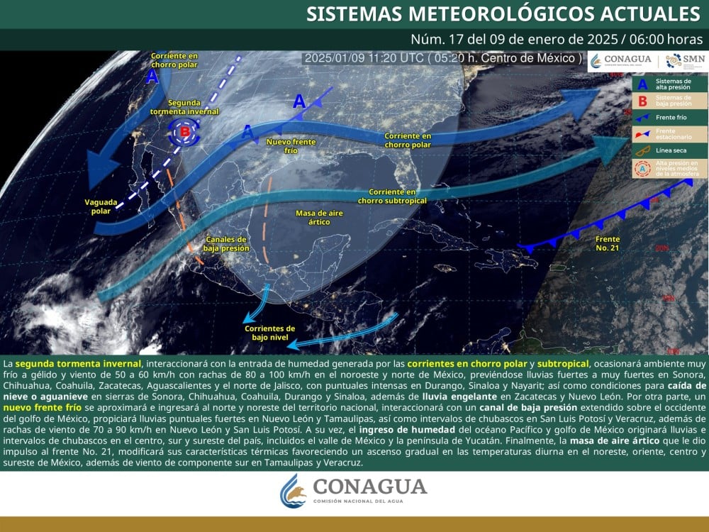 México se enfrenta a condiciones climáticas extremas este jueves debido a la interacción de la segunda tormenta invernal con corrientes de humedad provenientes de los océanos Pacífico y Atlántico. El fenómeno traerá lluvias intensas, vientos con rachas de hasta 100 km/h y la posibilidad de nevadas en varias regiones del país, alertó el Servicio Meteorológico Nacional (SMN).