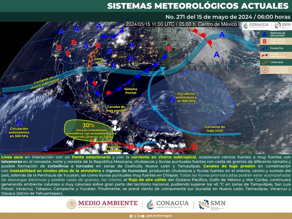 Por otra parte, una línea seca sobre el norte y noreste de México en interacción con un frente estacionario en el noreste país y con la corriente en chorro subtropical, ocasionará rachas de vientos fuertes a muy fuertes con tolvaneras en dichas regiones, chubascos y lluvias fuertes con caída de granizo de diferente tamaño y posible formación de torbellinos o tornados en Coahuila, Nuevo León y Tamaulipas.
