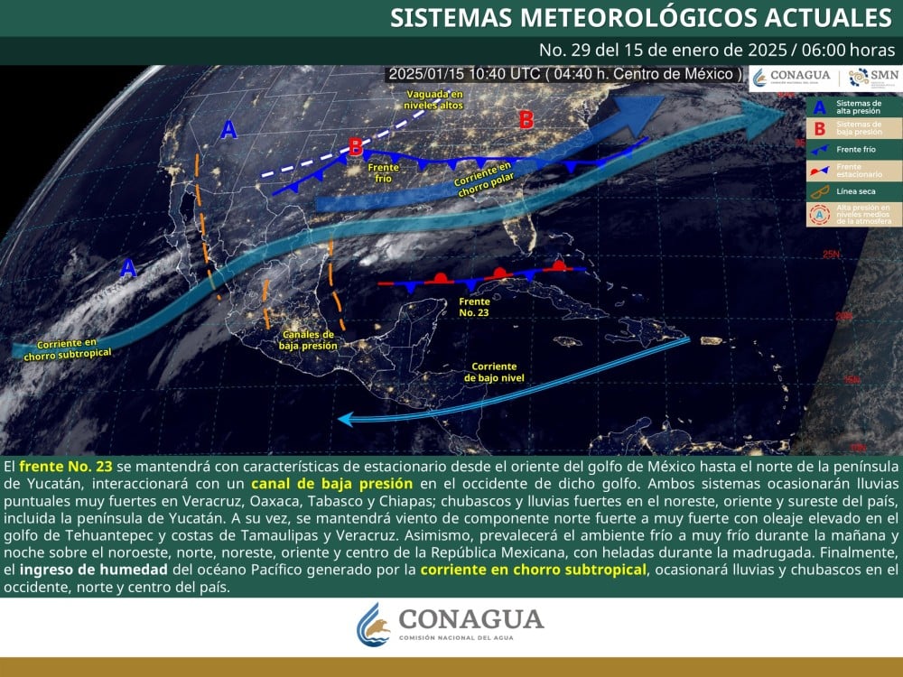 Este miércoles 15 de enero de 2025, el frente frío No. 23 mantiene su influencia en gran parte del país, causando diversos fenómenos meteorológicos que van desde lluvias intensas hasta temperaturas extremas. Estas condiciones están generando preocupación por posibles afectaciones en regiones vulnerables y demandan atención por parte de la población y las autoridades.
