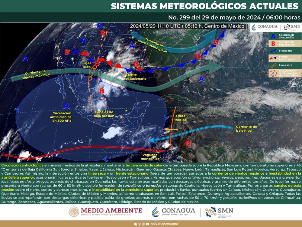 Así mismo, la interacción entre una línea seca sobre Coahuila y un frente estacionario (fuera de temporada) cercano a la frontera noreste de México, aunados a la corriente de vientos máximos e inestabilidad en la atmósfera superior, ocasionarán lluvias puntuales fuertes en Nuevo León y Tamaulipas, mismas que podrían originar encharcamientos, deslaves, inundaciones e incrementar los niveles en ríos y arroyos; además de chubascos en Coahuila; las lluvias estarán acompañadas con descargas eléctricas y granizo de diferentes tamaños. De igual forma, se presentará viento con rachas de 60 a 80 km/h y posible formación de torbellinos o tornados en zonas de Coahuila, Nuevo León y Tamaulipas.