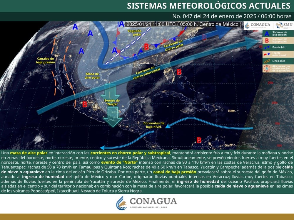 Este 24 de enero de 2025, una masa de aire polar combinada con las corrientes en chorro polar y subtropical ha generado un drástico descenso de temperatura en gran parte del país, afectando especialmente las zonas del norte, noreste, centro y sureste. Las condiciones climáticas adversas incluyen lluvias intensas, vientos fuertes y la posibilidad de caída de nieve o aguanieve en diversas regiones montañosas, alertaron las autoridades.
