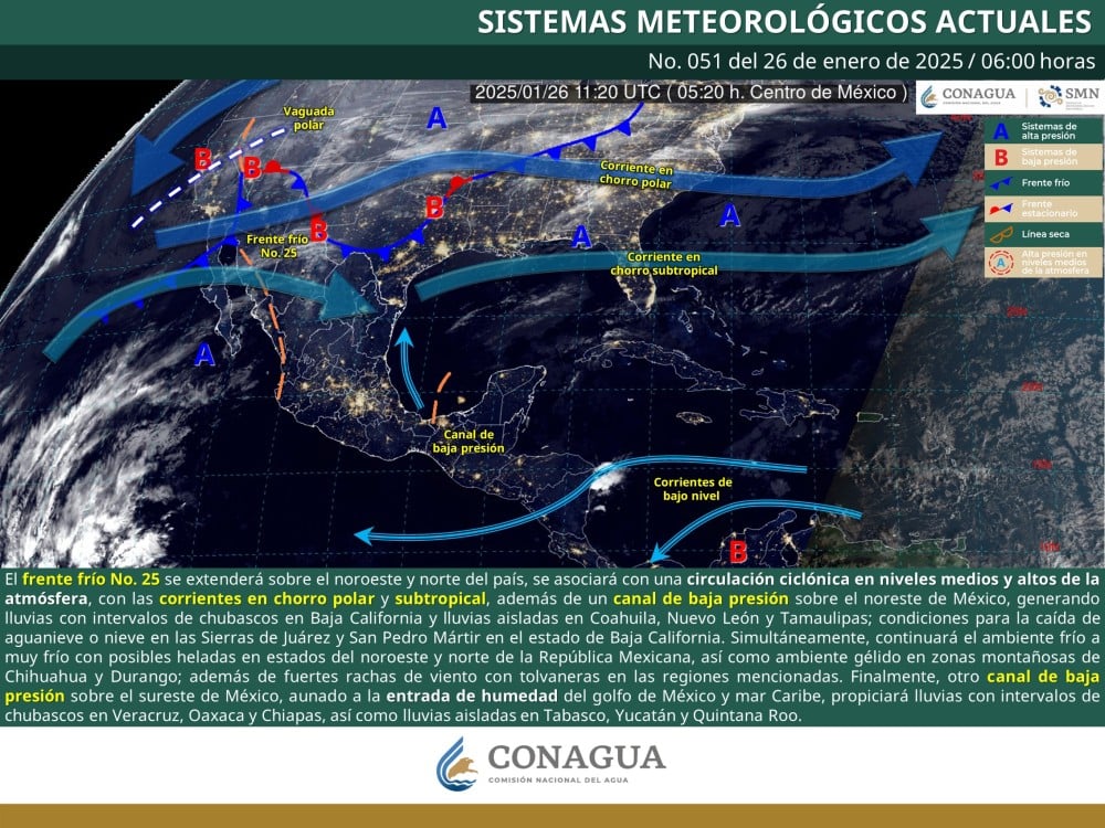 El frente frío No. 25 se ha convertido en el protagonista de las condiciones meteorológicas actuales al extenderse sobre el noroeste y norte del país, generando una combinación de fenómenos atmosféricos que afectan varias regiones. Su interacción con una circulación ciclónica en niveles medios y altos de la atmósfera, así como con las corrientes en chorro polar y subtropical, está provocando lluvias, temperaturas gélidas y vientos intensos.