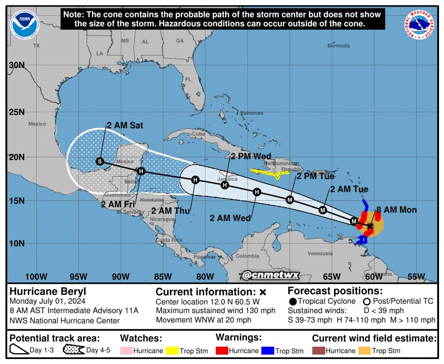 El huracán Beryl, clasificado como categoría 4 en la escala de Saffir-Simpson, está causando gran preocupación en el Caribe. Con vientos máximos sostenidos de 130 mph (215 km/h) y ráfagas aún más fuertes, Beryl se perfila como una amenaza seria para las Islas de Barlovento y el Mar Caribe.