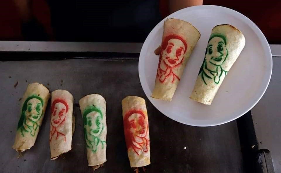 El taco lleva el rostro de Claudia Sheinbaum pintado sobre la tortilla, utilizando los colores emblemáticos de la bandera mexicana: rojo y verde.