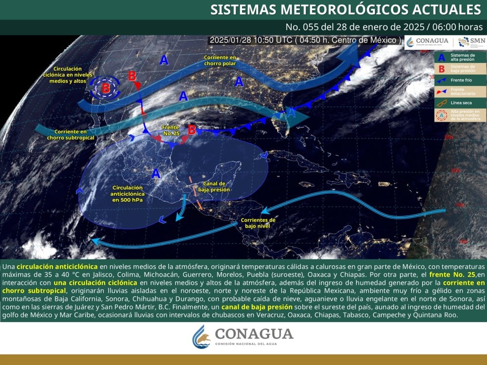En contraste, el frente frío No. 25, en combinación con una circulación ciclónica y la corriente en chorro subtropical, traerá temperaturas mínimas de -10 a -5 °C en las montañas de Baja California, Sonora, Chihuahua y Durango, con probabilidad de nieve o lluvia engelante en el norte de Sonora y las sierras de Juárez y San Pedro Mártir, Baja California.