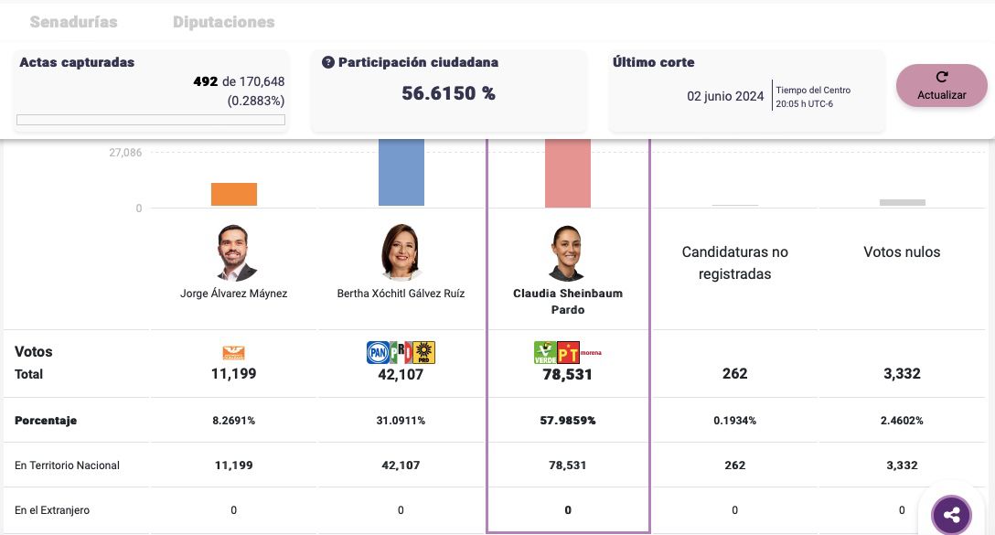 Nahle, quien se posiciona con una amplia ventaja sobre su competidor más cercano, José “Pepe” Yunes, el candidato de la coalición PRI-PAN-PRD. Este resultado subraya el fuerte apoyo que Morena ha consolidado en varias regiones del país.