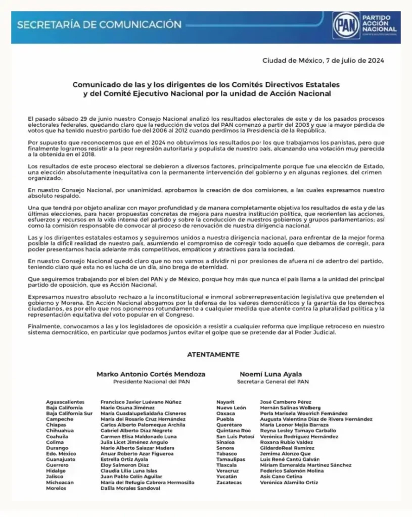 El comunicado también expresó el rechazo del PAN hacia lo que describieron como una “inconstitucional e inmoral” sobrerrepresentación legislativa promovida por el gobierno y Morena, subrayando la postura crítica del partido frente a las políticas adversarias.