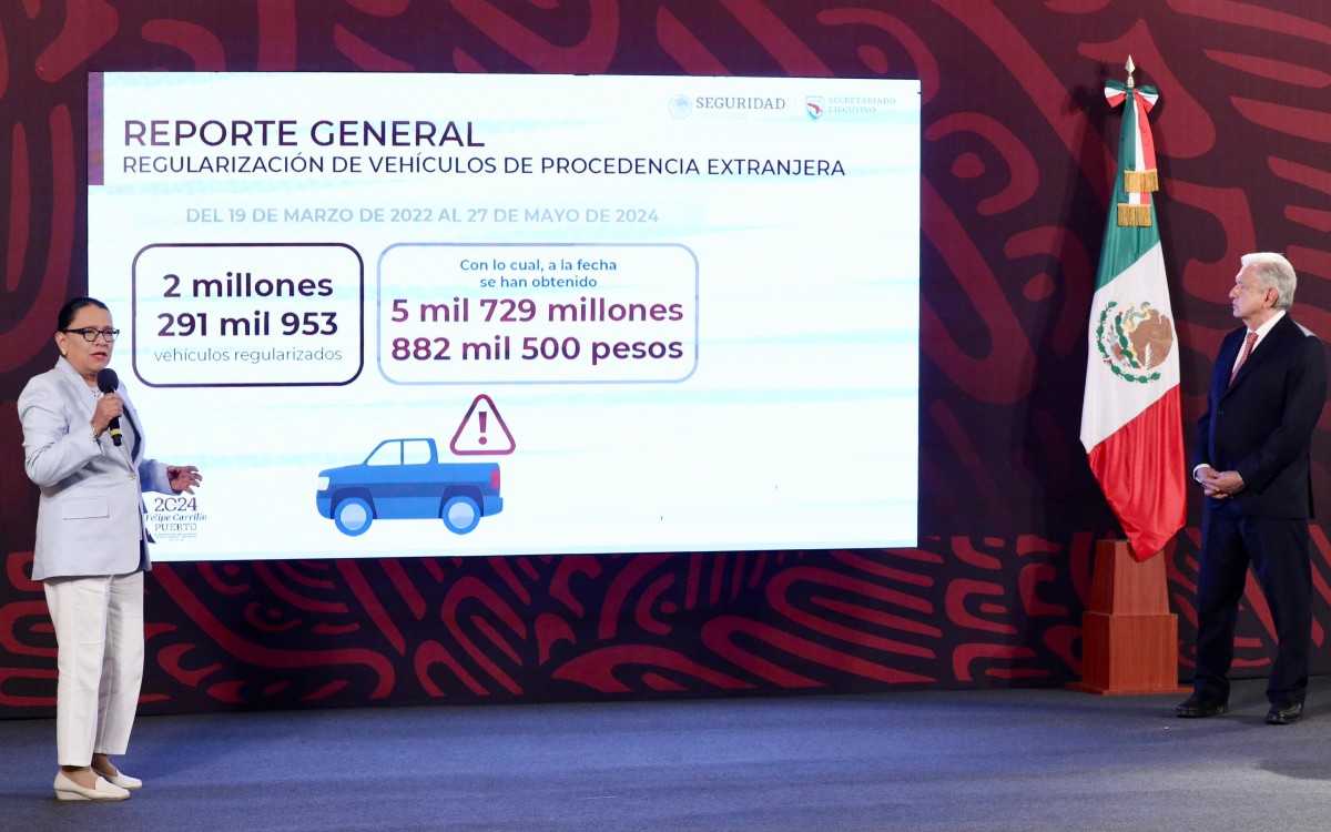 La secretaria de Seguridad y Protección Ciudadana, Rosa Icela Rodríguez, informó que hasta la fecha, 2 millones 291 mil 953 vehículos usados de procedencia extranjera han sido regularizados en México, dicho programa ha permitido ingresar 5 mil 729 millones 882 mil 500 pesos al erario público, recursos que se destinan a la pavimentación de calles en las 17 entidades donde opera.