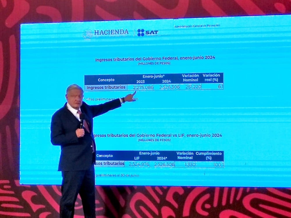 Además, López Obrador subrayó el continuo aumento en la recaudación de impuestos, un indicador de la estabilidad y salud económica del país. “En el primer semestre de 2024, se recaudaron 2,526,303 millones de pesos por ingresos tributarios, un aumento real del 6.1% respecto al mismo periodo de 2023”, precisó, mostrando las tablas correspondientes.
