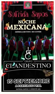 Para una opción más relajada y familiar, SuFrida en Los Sapos ofrece una noche divertida con la presentación del Grupo Clandestino a partir de las 21:00 horas del 15 de septiembre. El lugar no tiene cover y ofrece un menú variado que incluye pizza, snacks y carne asada, ideal para disfrutar en compañía de amigos o familiares.