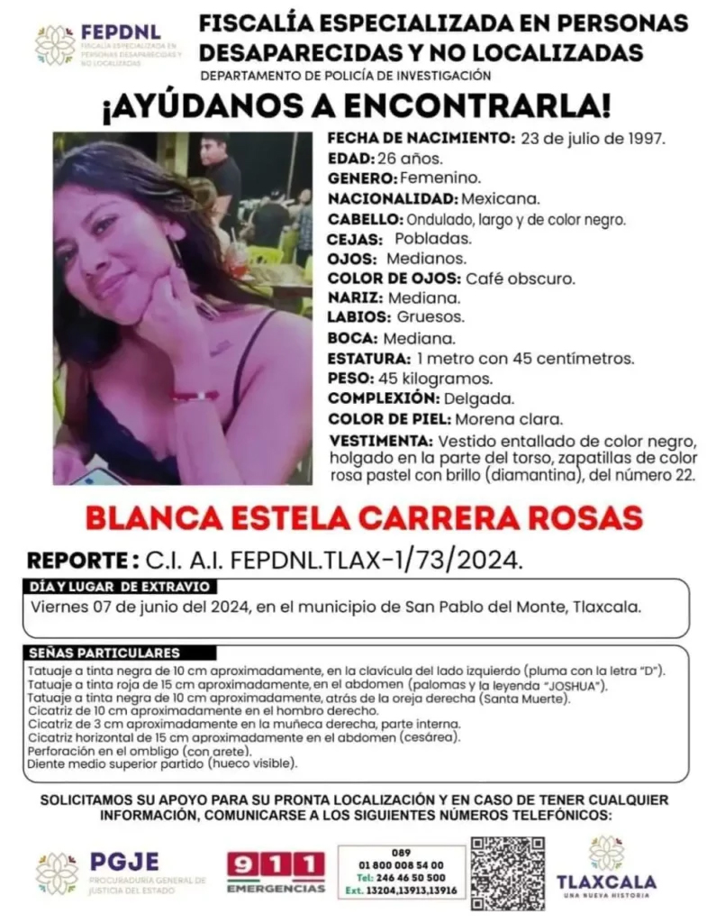 Blanca Estela Carrera Rosas, de 26 años y originaria de Orizaba, Veracruz, ha estado desaparecida desde el pasado 7 de junio de 2024, tras una discusión con una amiga fuera del centro nocturno Bora Bora en la Vía Corta a Santa Ana, en los límites entre Puebla y Tlaxcala. Esta situación ha generado una intensa búsqueda por parte de sus familiares y una creciente preocupación en la comunidad.
