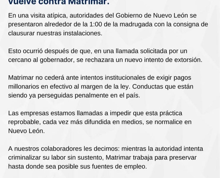 La empresa extractiva Matrimar acusó al gobierno de Nuevo León de ejercer presión indebida…