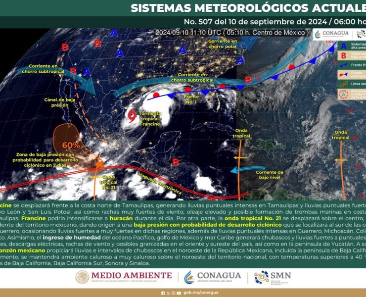 El Servicio Meteorológico Nacional (SMN), prevé que para este día, Francine se desplazará frente a la…